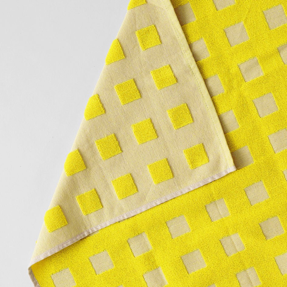 Lieben Sie Schlichtheit mit dem gewissen Etwas? Dann ist dieses grafisch karierte Geschirrtuch in Gelb und Beige genau das Richtige für Sie. Entworfen von der Londoner Designerin Kangan Arora, bekannt für ihren kräftigen Einsatz von Farben und grafischen Mustern, strahlt dieses Geschirrtuch ruhige Eleganz mit einem verspielten Touch aus.