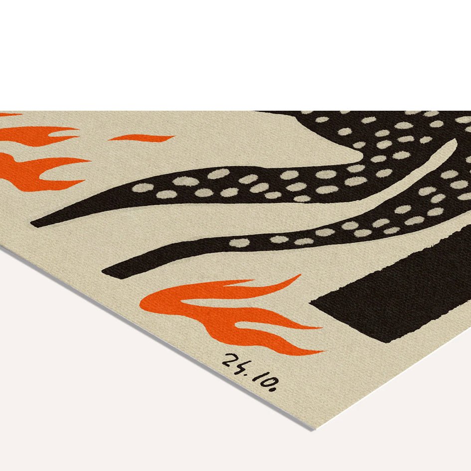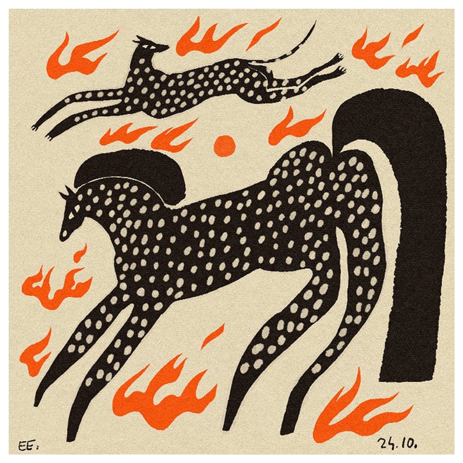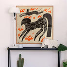 "Matching Outfits" features a dynamic duo in perfectly coordinated patterns . Bring strength, playfulness, and symbolism together on your wall with this striking art print of a black-and-white spotted dog and horse. In this work by Hungarian artist and illustrator Enikő Eged, animal connection and visual harmony are enhanced by fiery orange flames dancing around the duo.