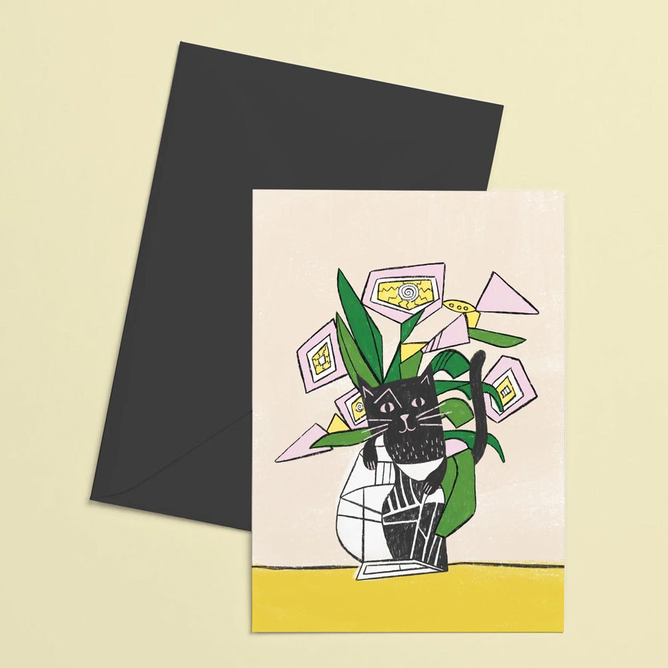 A creative nod to Picasso—in cat form, of course! This fun and original illustrated greeting card features Pablo Picatso as an artistic cat with a vase of flowers in its paws. Geometric, quirky, and full of character—exactly what you'd expect from Niaski.