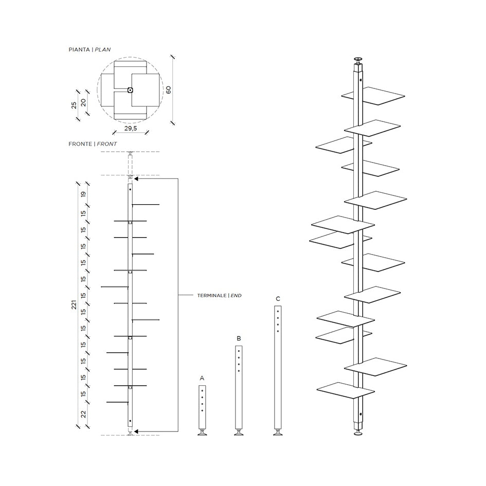 De Adelaide boekenkast is ontworpen door Claudio Bitetti voor Mogg en is verkrijgbaar in mat zwart ijzer of in Iroko massief hout. De Adelaide Metal boekenkast is ontworpen om tussen de vloer en het plafond te klemmen. De hoogte van het plafond kan hierbij variëren van 236 tot 302 centimeter. Het is een elegante boekenkast, met 13 planken die twee verschillende maten hebben. De kleine planken zijn 30 centimeter lang en 20 centimeter breed, de grotere planken zijn 30 centimeter lang en 25 centimeter breed.