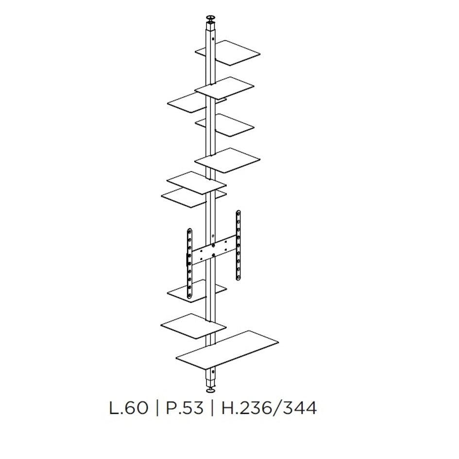 De Adelaide tv-meubel is ontworpen door Claudio Bitetti voor het Italiaanse Designmerk Mogg en is verkrijgbaar in mat zwart ijzer of in Iroko massief hout. De Adelaide Metal tv-meubel is ontworpen om tussen de vloer en het plafond te klemmen. De hoogte van het plafond kan hierbij variëren van 236 tot 302 centimeter. Het is een elegant tv-meubel, met 13 planken die twee verschillende maten hebben. De kleine planken zijn 30 centimeter lang en 20 centimeter breed, de grotere planken zijn 30 centimeter lang en 25 centimeter breed.
