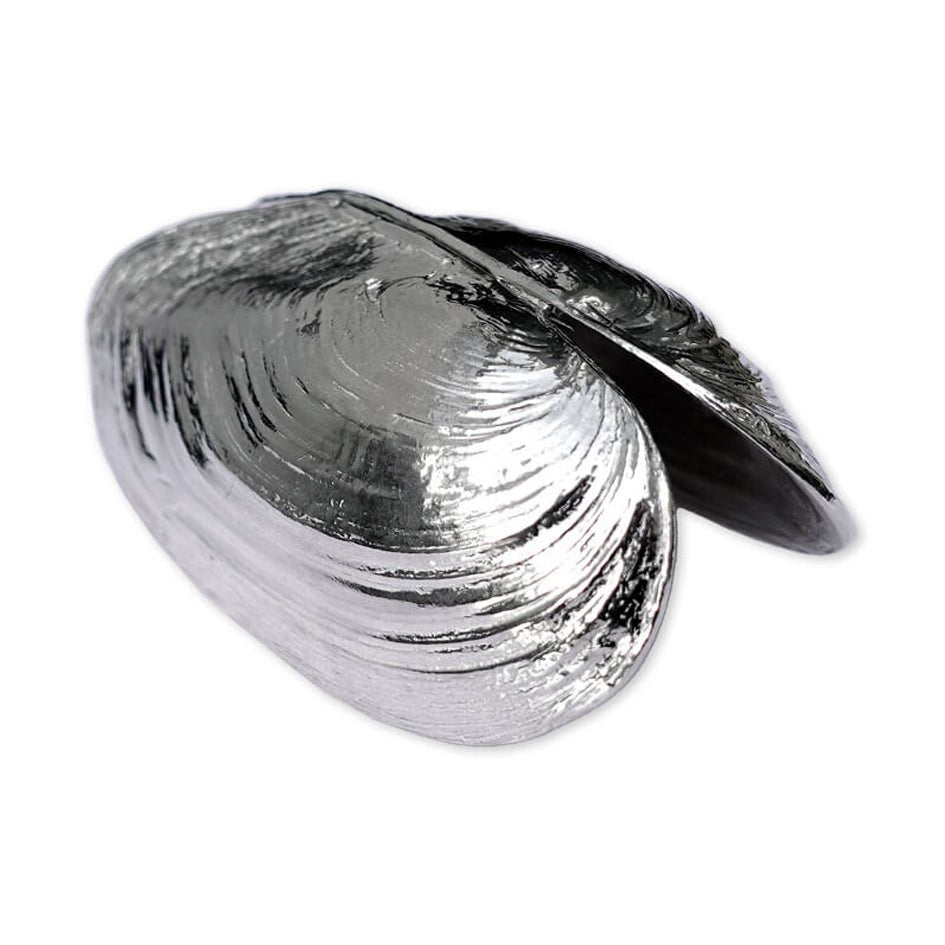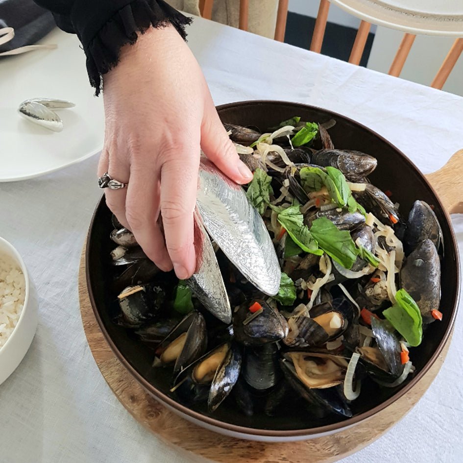 Dankzij het speciale veersysteem opent en sluit de mosselschep net als een echte schelp. Perfect om mosselen te presenteren, op te scheppen of gewoon als blikvanger op tafel.